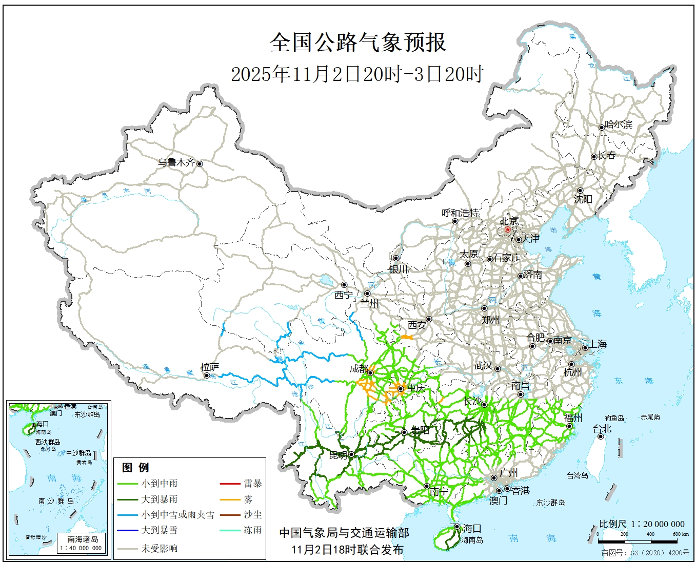 中国气象局与交通运输部2025年11月02日联合发布全国主要公路气象预报