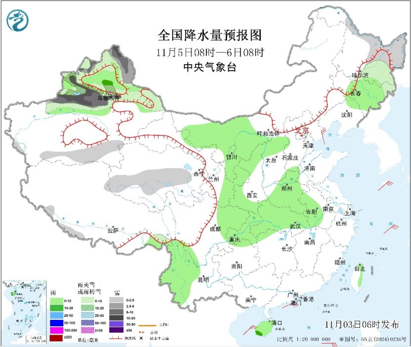 较强冷空气蓄势待发。预计5日至9日,又将有一股较强冷空气自西向东影响我国大部地区。其中,5日至7日,冷空气将率先影响新疆、青藏高原西部及内蒙古西部,带来6~8℃降温,新疆沿天山地区降幅可达10~16℃;并伴有4~6级风,山口地区风力可达8~9级、阵风10~11级;新疆北部有小到中雪或雨夹雪,高海拔地区有大到暴雪、局地大暴雪,新增积雪深度8~12厘米,局地15~22厘米。请公众注意关注预报信息,及时增添衣物。
