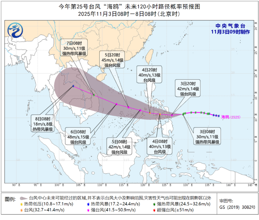 部分海域风力较大。目前,冷空气对内蒙古及东北地区的影响已趋于结束,今天气温将开始回升。随着冷空气入海,未来三天,东海、台湾海峡、南海北部等海域将有6~8级风、阵风9~10级。今年第25号台风“海鸥”(强热带风暴级)4日穿过菲律宾中部,5日将移入南海东南部海面,强度逐渐加强,最强可达强台风级(42~50米/秒,14~15级),逐渐趋向于越南中部沿海。受其影响,5日至7日,南海中南部及中沙群岛、南沙群岛和西沙群岛将有明显风雨天气。在相关海域航行、作业的船舶需关注“海鸥”移动趋势,避开大风区域。